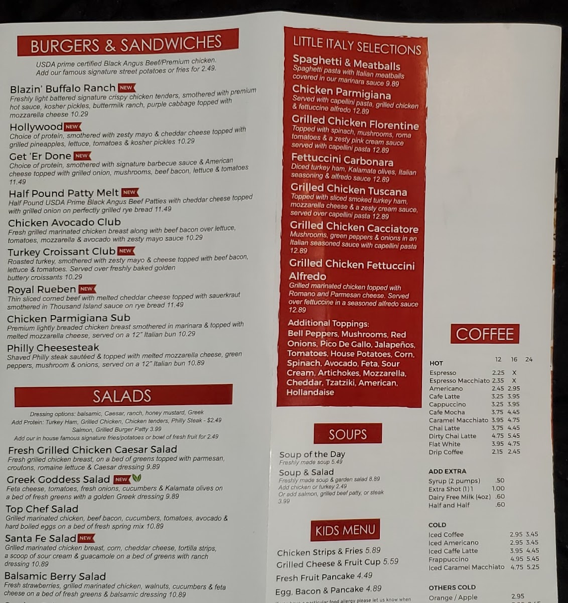 For the younger patrons, the Kids Corner features delightful choices such as Chicken Strips and Fresh Fruit Pancakes, promising to satisfy even the pickiest eaters.
